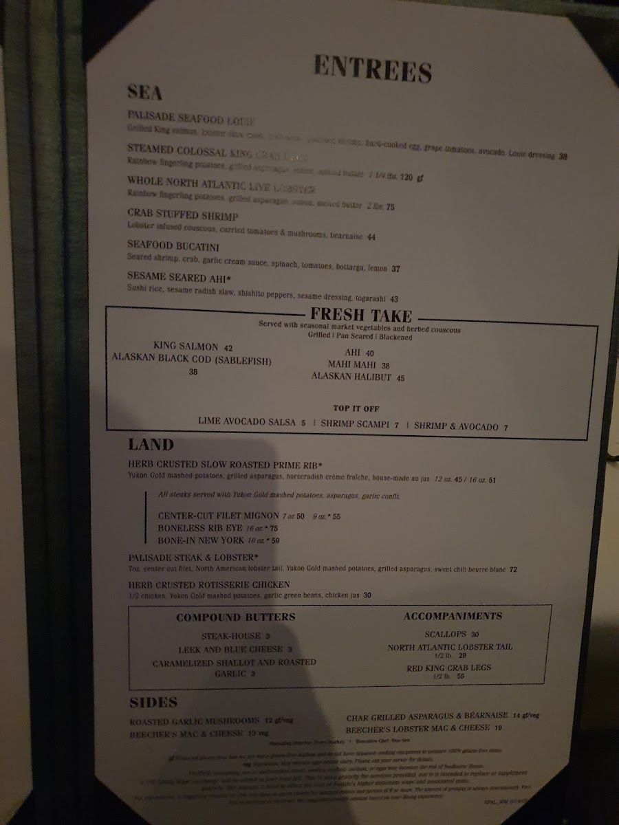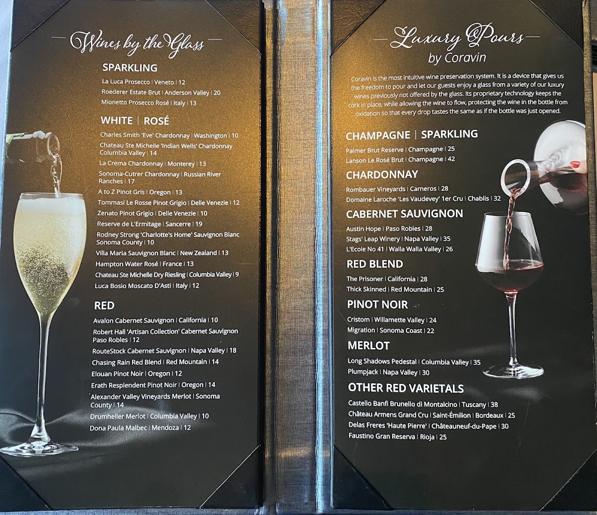 Dined here on Saturday night, party of 4. The restaurant, decor and atmosphere is lovely and very fine dining. Can view the marina from almost every table. Beautiful indoor water/fountain features. The food was superb. We had 1 app, an entree each, a few drinks and 1 desert for about 400. Easy parking, they also have valet. It's was my MIL birthday which I put in the reservation. They had a nice card & rose petals when we arrived and ended with a slice of cake with a candle. Everyone enjoyed the experience.
