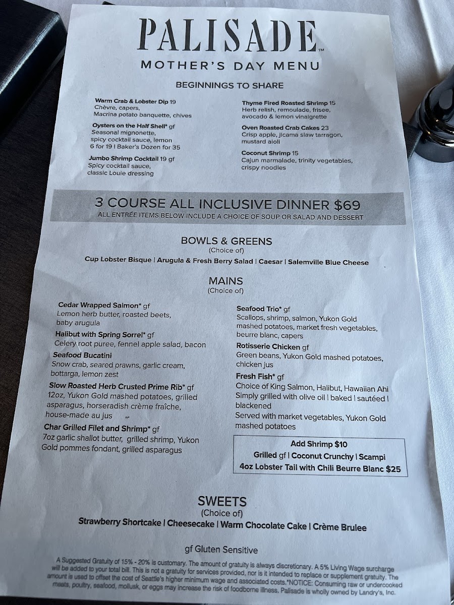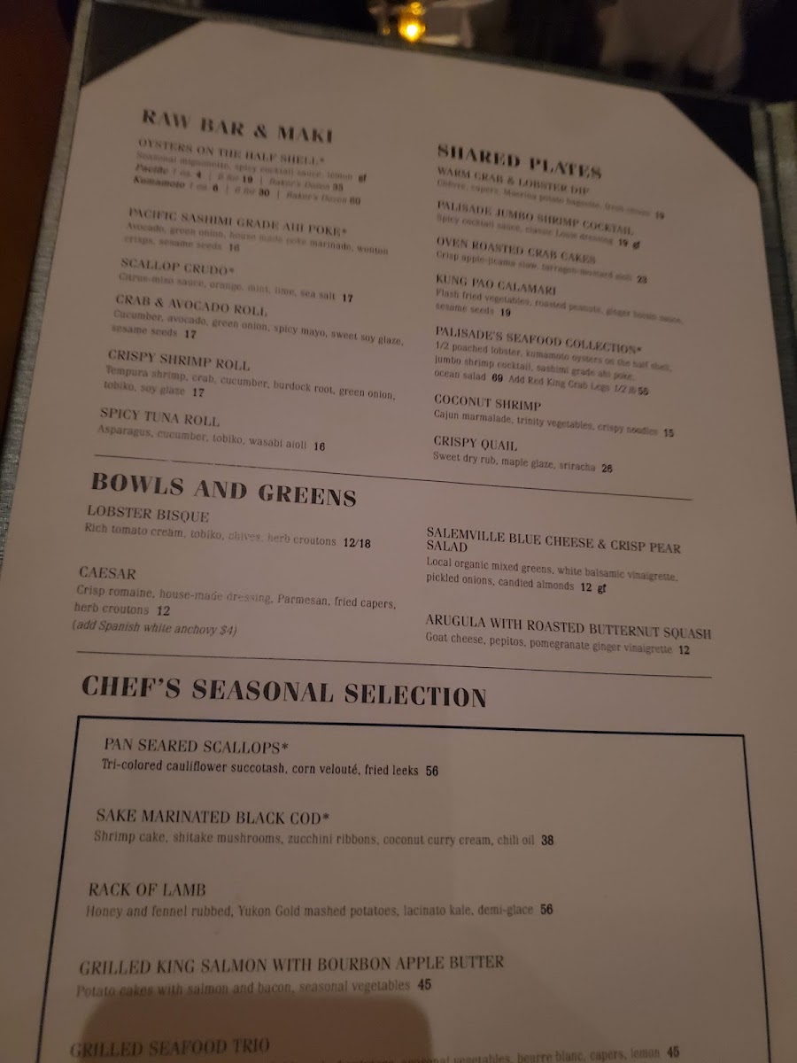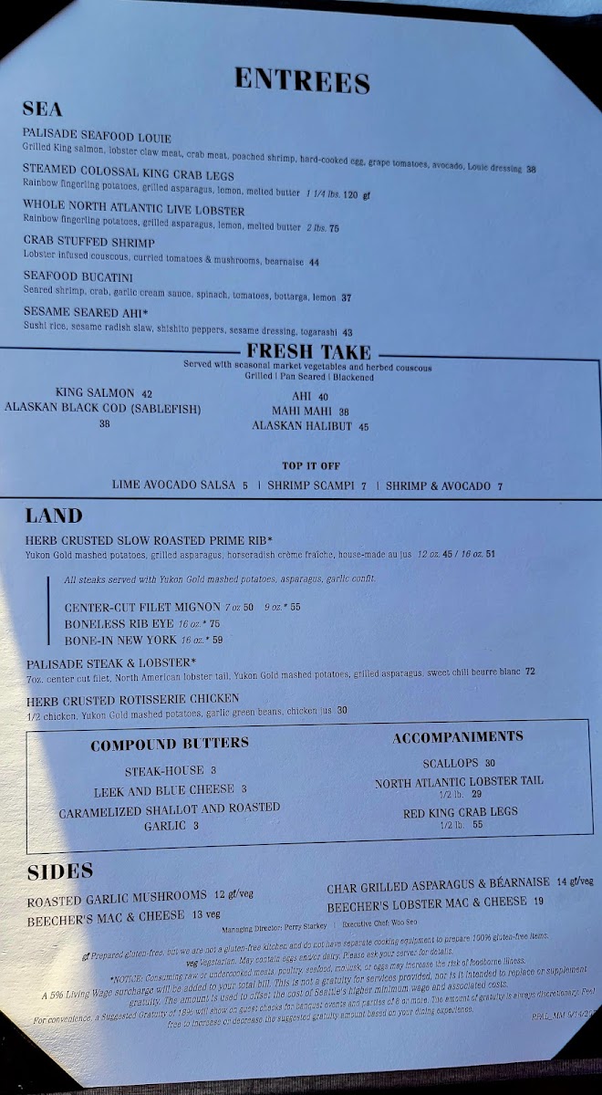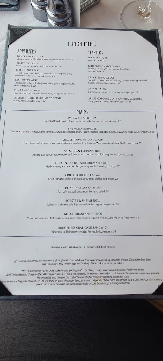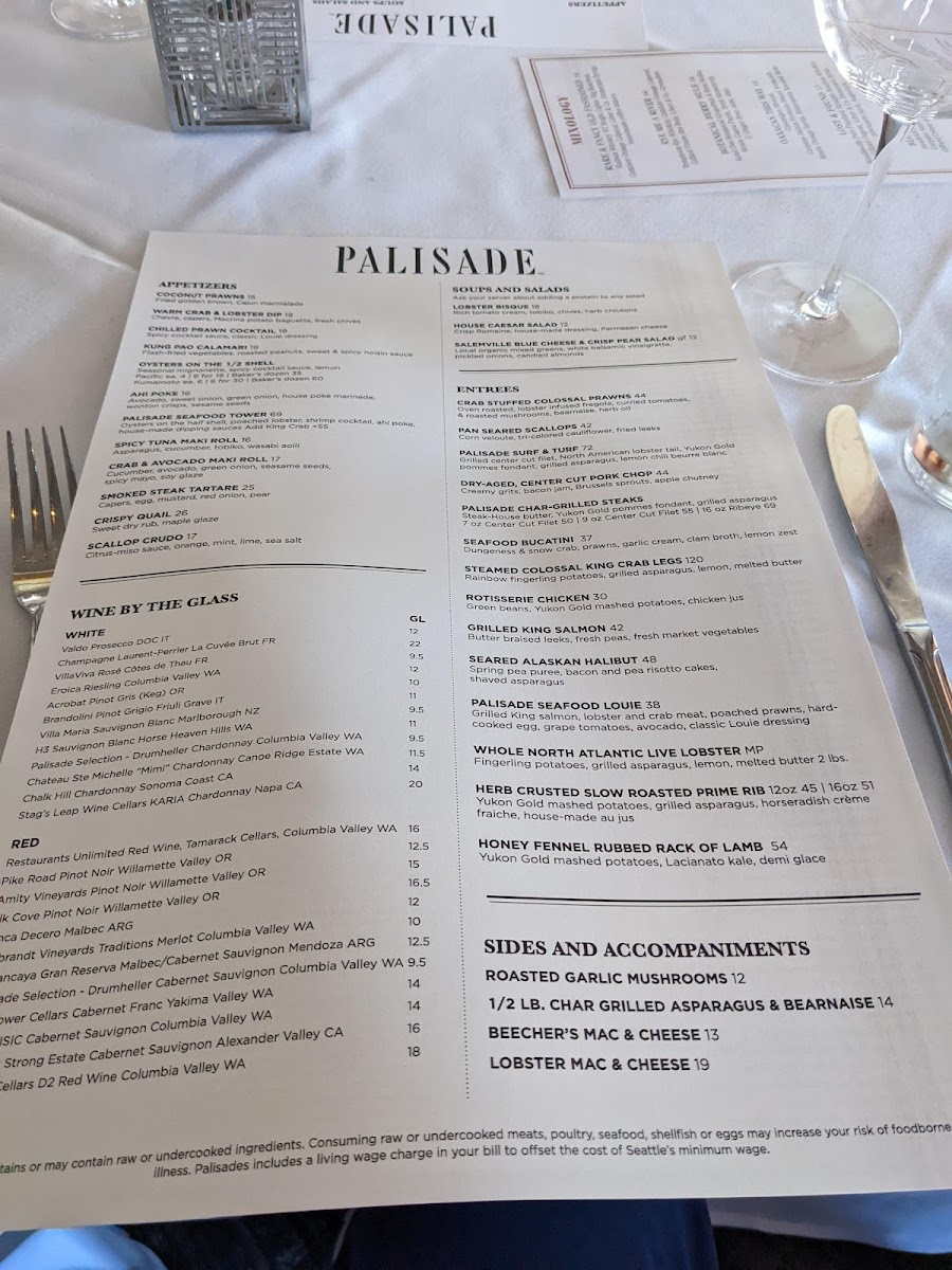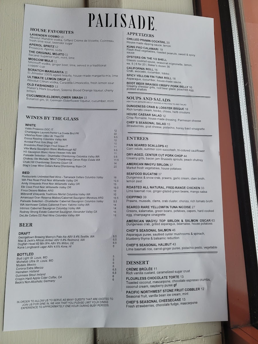 Review - The Palisade 07 June 2025 We're always on the hunt for fantastic restaurants, and The Palisades, a recent recommendation from friends, absolutely hit the mark! Located just north of Seattle, this restaurant offers spectacular 180-degree water views across the bay, overlooking the cruise ship port and neighboring the Seattle Yacht Club. The grand entrance and expansive, high-ceiling interior perfectly complement the stunning waterfront setting. While the impressive wine list and well-curated menu (beautifully presented, might I add!) certainly contribute to the appeal, it's the exceptional service that makes The Palisades truly shine. Our server, Justin, was phenomenal – friendly, enthusiastic, and attentive. He truly understands that a wonderful dining experience isn't just about the food; it's about the people who serve it. We highly recommend asking for him! This was a solid 5-star visit, and we can't wait to return. Do yourself a favor and try The Palisades!